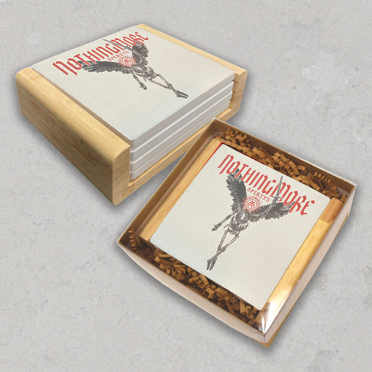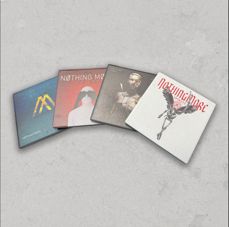 4" x 4" stone coasters with featuring the four different album covers in a wooden holder.